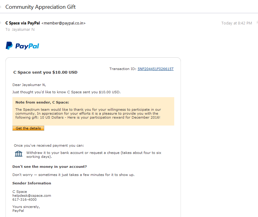 Reward from CSpace for the month of December 2016 January 12, 2017January 12, 2017 Jayakumar N Previous Next $10 community appreciation gift from CSpace