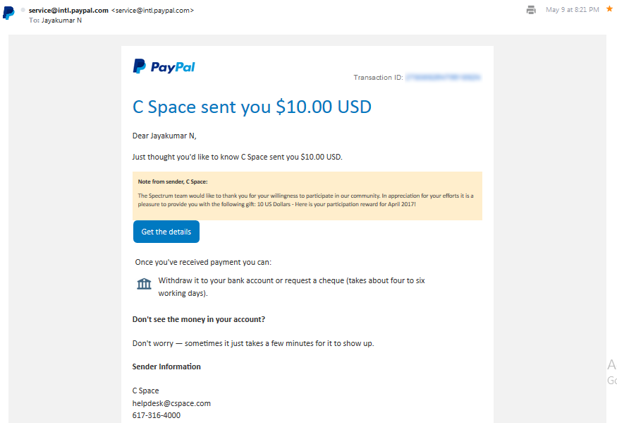 CSpace community reward May 2017 June 23, 2017June 23, 2017 Jayakumar N Previous Next $10 PayPal cash from CSpace community CSpace community reward May 2017