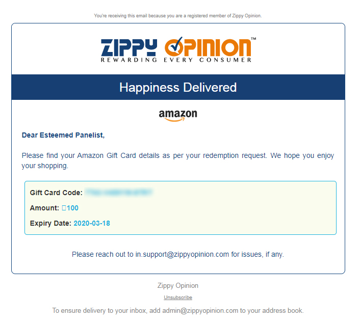 INR 500 (100 x 5) Amazon Gift voucher from Zippy Opinion July 21, 2019July 21, 2019 Jayakumar N Previous Next INR 500 Amazon Gift voucher from Zippy Opinion